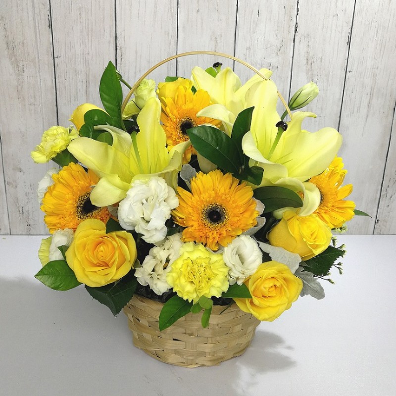 Wishes do come true. This delightful arrangement is full of sunny blossoms, it includes brilliant yellow roses, asiatic lilies, miniature gerberas, carnations with delightful seasonal greenery joined in a basket. It's a basket of wonder and wishes!