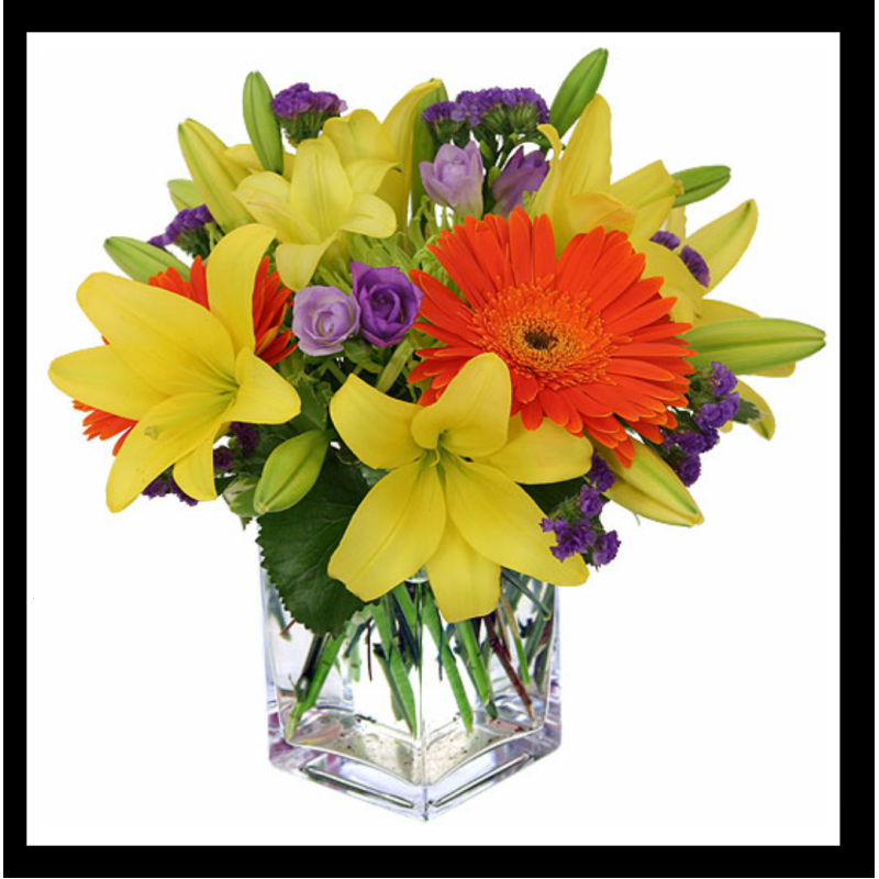 Fresh Yellow Lily with Orange color Gerberas and purple color match flowers arrange in a Vase, wonderful !