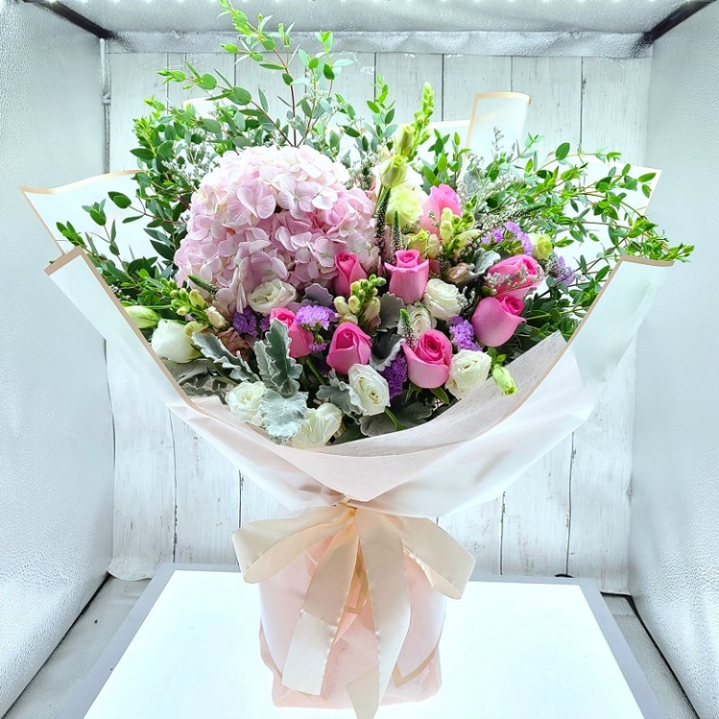 A Perfect Hydrangea with one Dozen Roses in Pink Color, it is perfect for your dream lover and pink lady