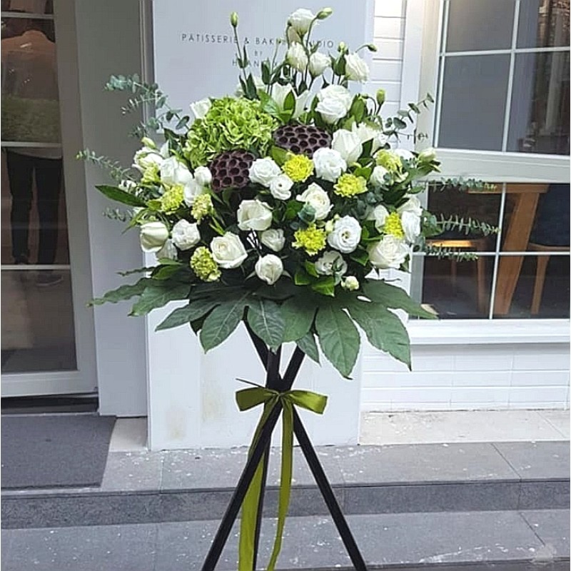 An elegant sympathy wreath of fresh white flowers with seasonal flowers.