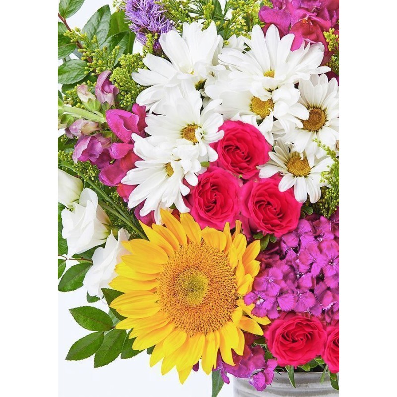 Six Red Roses, Sun Flowers, Eustoma and Snapdragon Vase arrangement, this vase arrangement contain Two Yellow Sun Flowers, five Eustoma, two Snapdragon, Rosemary , a Premium Glasses