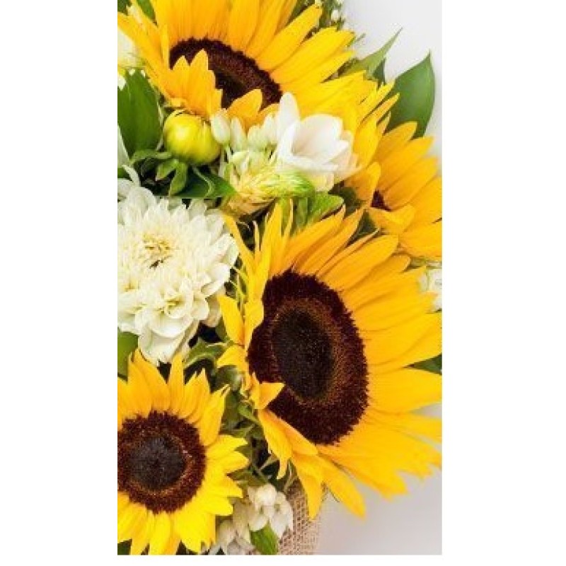 This Sunny Flowers Bouquet with 5 Sun Flowers and Eustoma, Sala Tip and greeny leag in Nice Packing