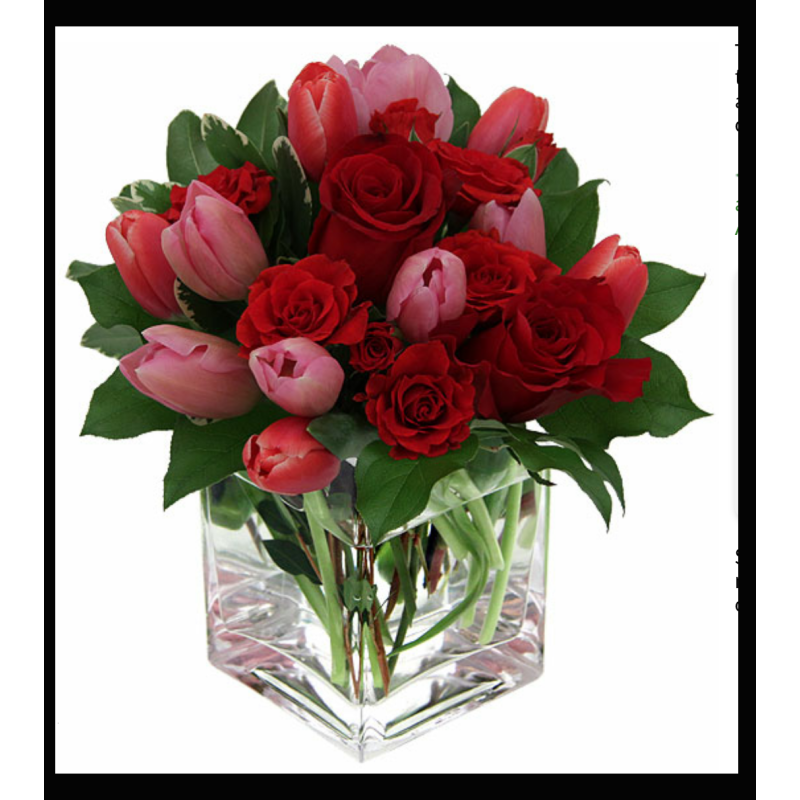 Six Red Roses and Six Orange Tulips and Six Pink Tulips arrange in a Square Vase, This is SPRING